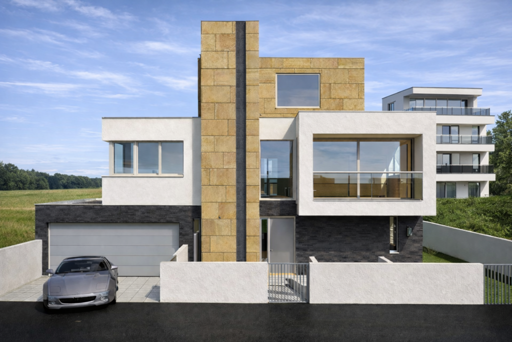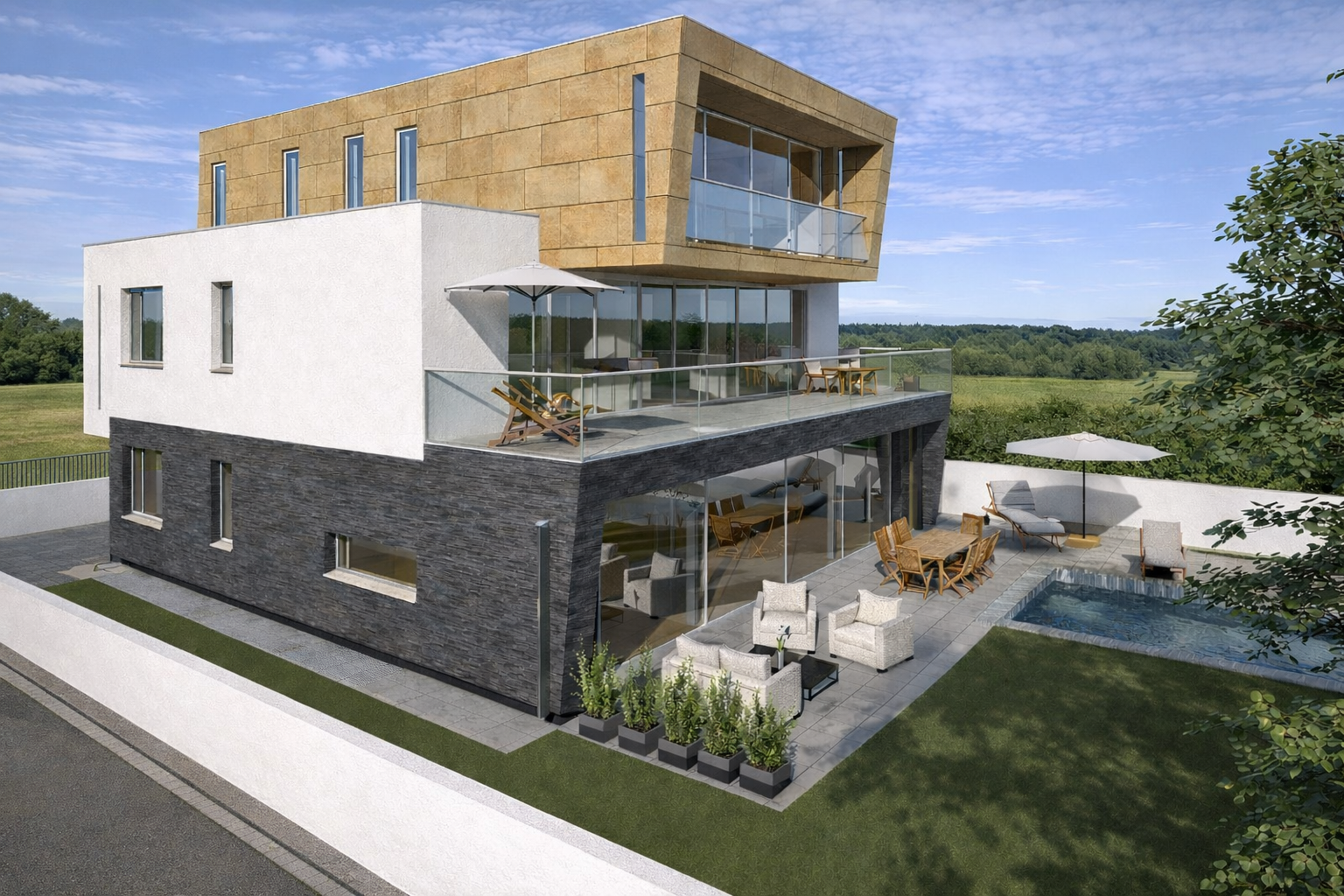DATEN Grundstücksgröße: 562 m² Bebauungsfläche: 192 m² 4 Geschoße Nutzflächen (Terrasse, Balkone, Pool)